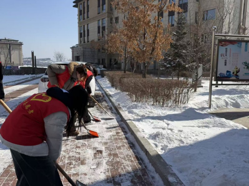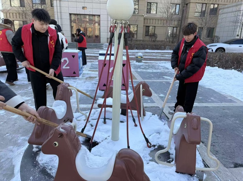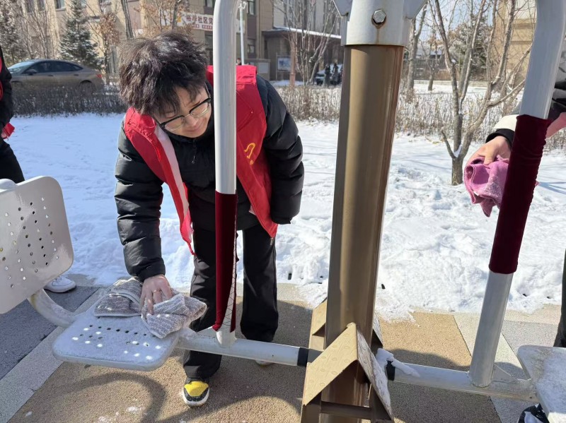 初春时节,裕华社区部分道路仍残留积雪,给居民出行带来不便。志愿者们手持铁锹、扫帚等清扫工具,分工协作、默契配合,对社区主干道、楼前台阶的冰雪进行集中清理。尽管春寒料峭,但同学们干劲十足,经过2小时奋战,累计清理积雪区域200余平方米,开辟出一条条“安全通道”。随后,志愿者们转战社区健身广场,对滑梯、单杠等公共设施进行擦拭。